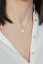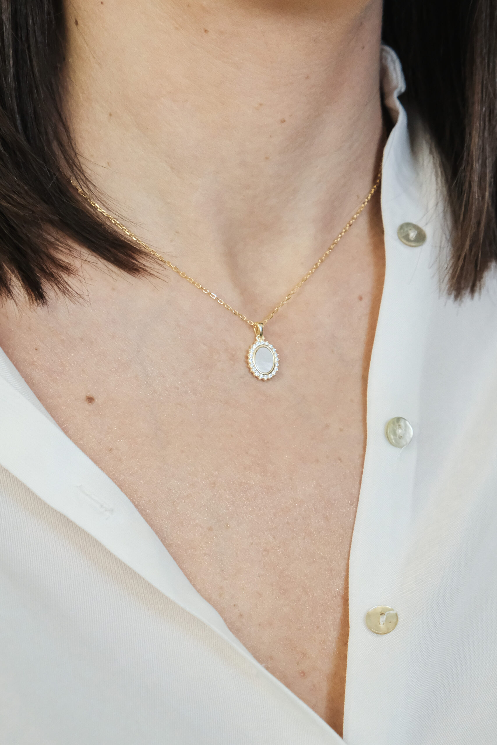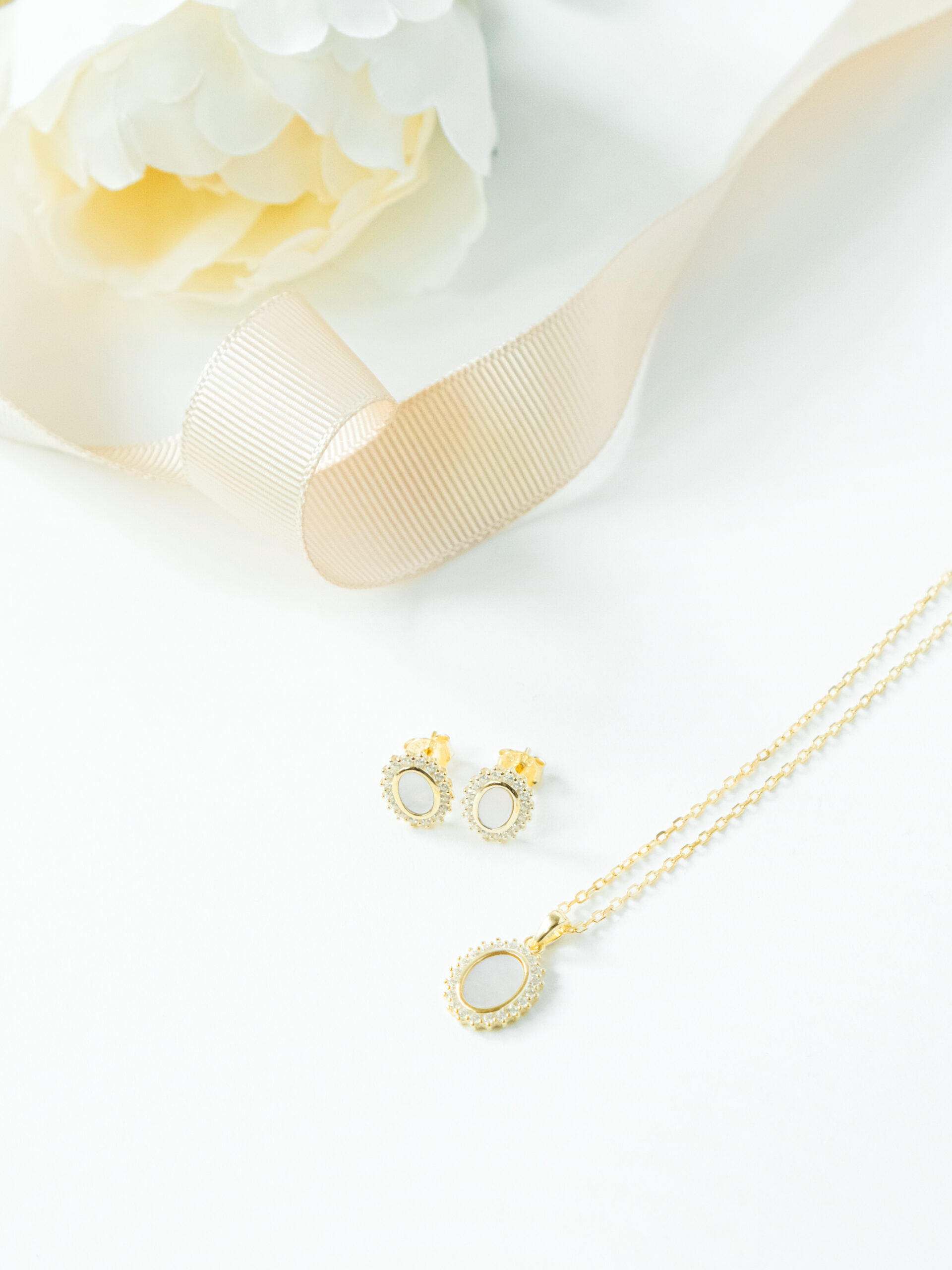 Ovaj prefinjeni set sastoji se od lančića i minđuša sa ovalnim belim detaljima, uokvirenim nizom sitnih cirkona. Zlatni ton unosi toplinu i sofisticiranost, dok nežne nijanse bele daju klasičan i damski pečat. Savršen je izbor za posebne prilike, ali i kao poklon koji se pamti.