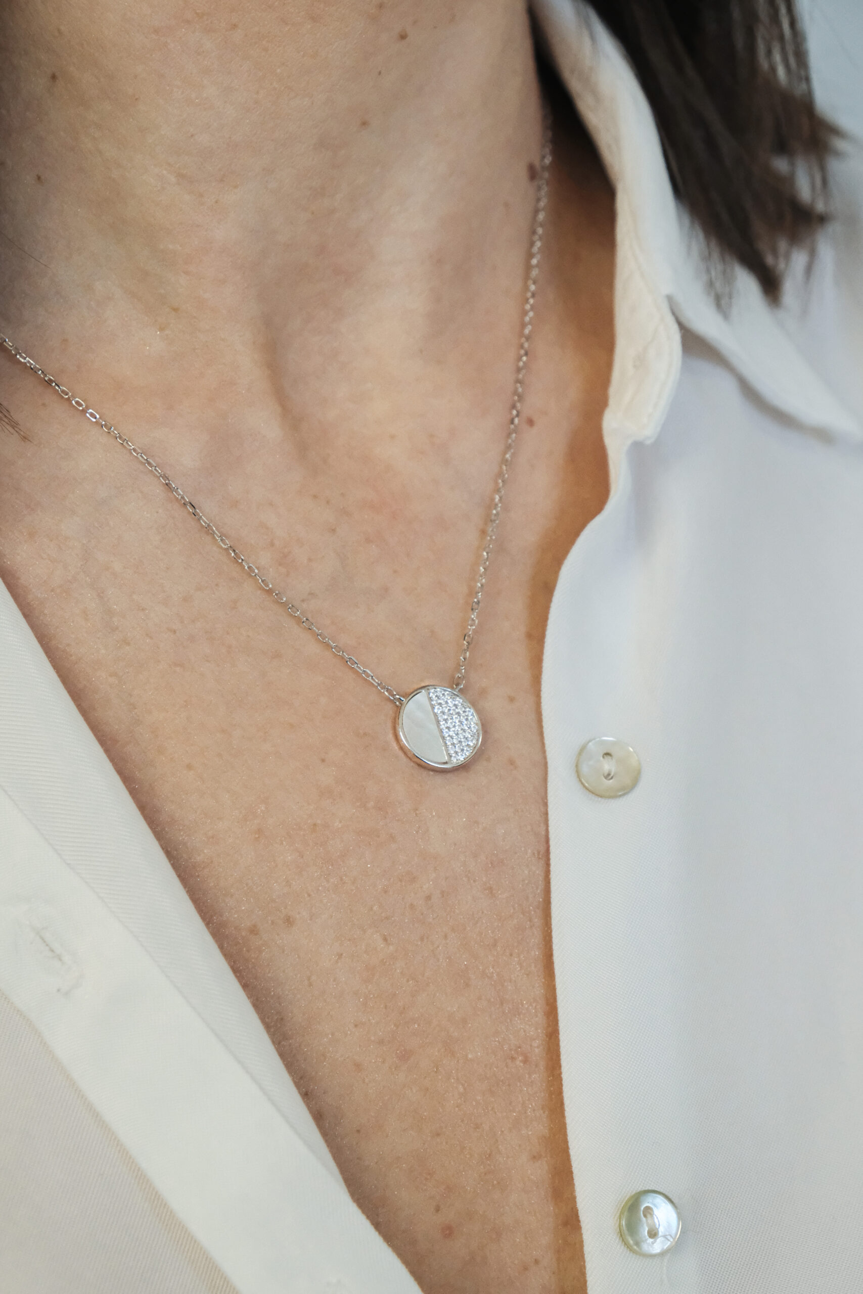 Ovaj moderan srebrni set sadrži lančić i minđuše kružnog oblika, podeljene na dve polovine – jednu glatku i jednu ukrašenu finim cirkonima. Dizajn je minimalistički, ali upečatljiv, savršen za dame koje vole svedeni stil sa daškom elegancije.