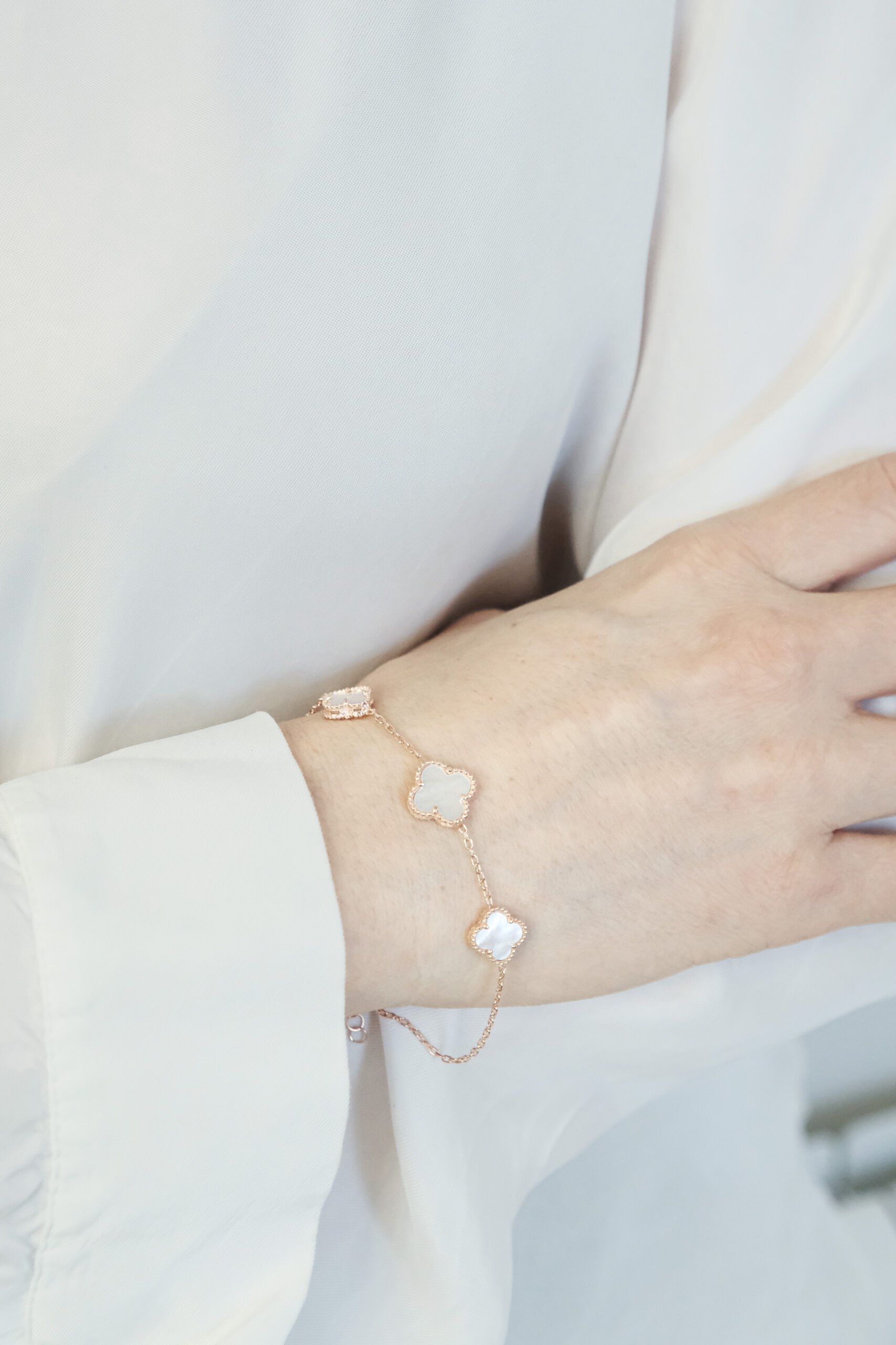 Nežna narukvica u boji roze zlata sa prefinjenim detelinama od sedefa. Dizajnirana za žene koje veruju u lepotu detalja i moć nežnosti.